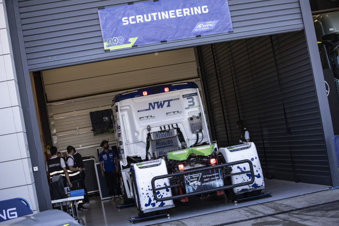 Ins erste Rennen ging Sascha vom dritten Startplatz aus und so war der Urmitzer auf dem besten Wege seinen Vorsprung in der Gesamtwertung weiter auszubauen. Doch kurz vor Rennmitte stockte vielen Fans der Atem – der MAN Racetruck vom Team SL Trucksport 30 rollte ohne Vortrieb aus.